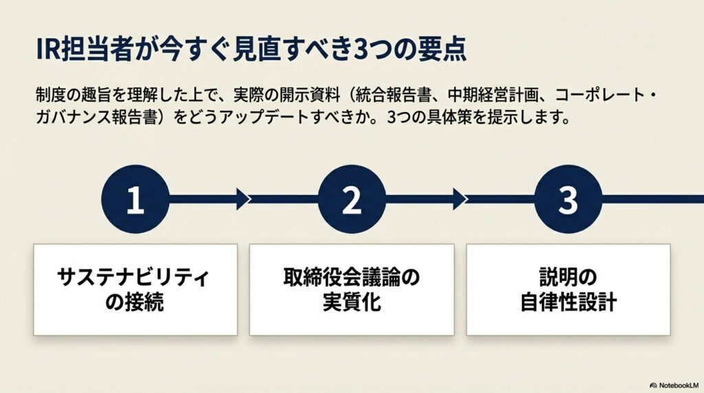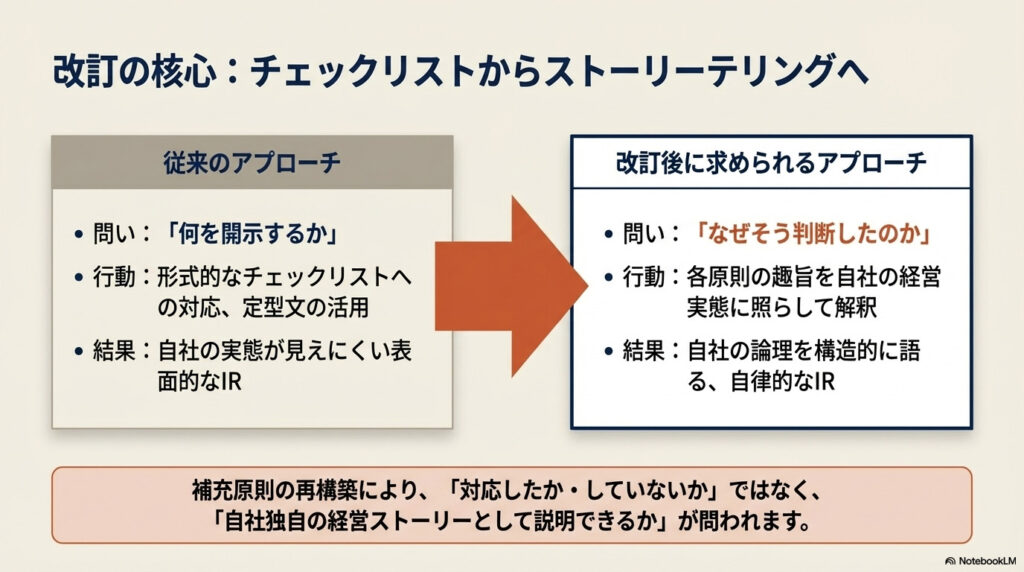 補充原則の再構築により、形式的なチェックリストへの対応は簡略化されます。その代わりに、各原則の趣旨を自社の経営実態に照らして解釈し、自律的に説明することが求められる構造になります。この変化は、IR発信の設計にも直結しますよね。
