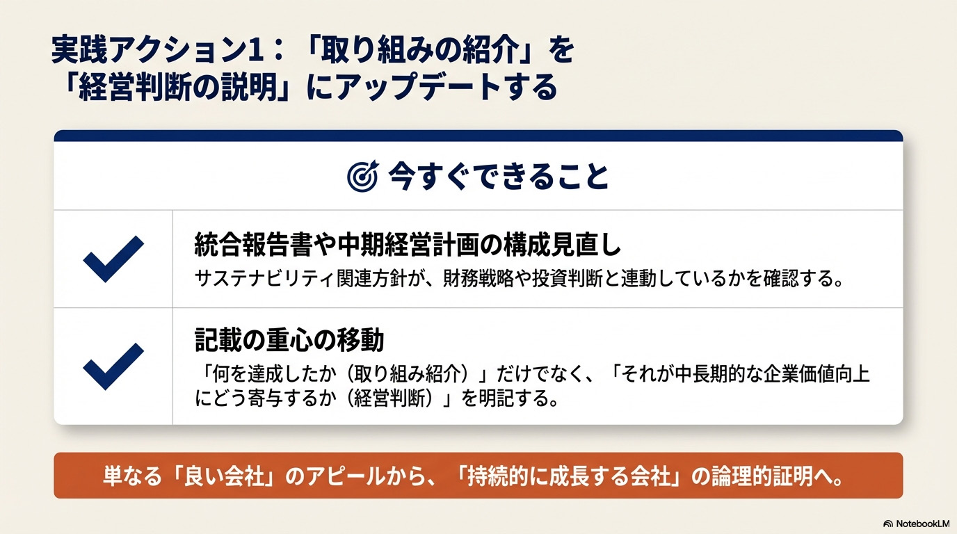 統合報告書や中期経営計画において、サステナビリティ関連の方針が財務戦略や投資判断とどう連動しているかを明示しましょう。「取り組みの紹介」から「経営判断の説明」へ、記載の重心を移すことが大切です。
