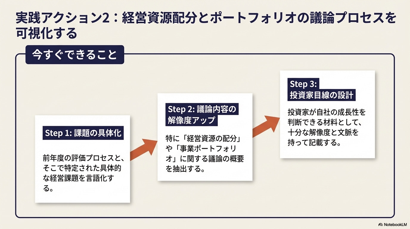 そのため、取締役会の実効性評価の開示においても、定型的な内容から一歩進んで、評価プロセスと課題の具体化を進めましょう。特に、経営資源の配分や事業ポートフォリオに関する議論の概要を、投資家が判断材料にできるレベルで記載することができると、非常に充実した内容として評価されるでしょう。