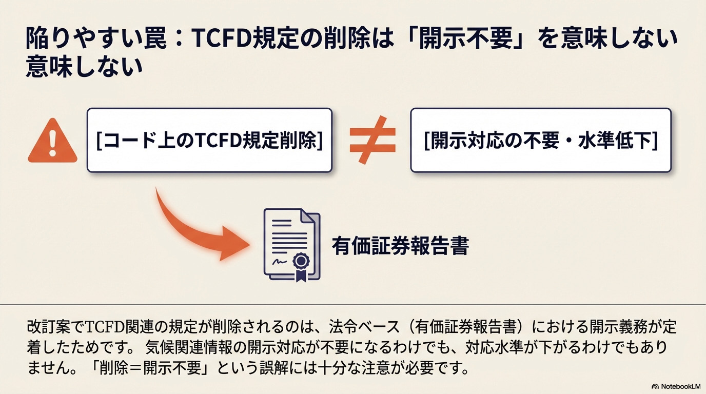 ⚠️ 注意したいポイント:TCFDの削除は「対応水準の引き下げ」ではない