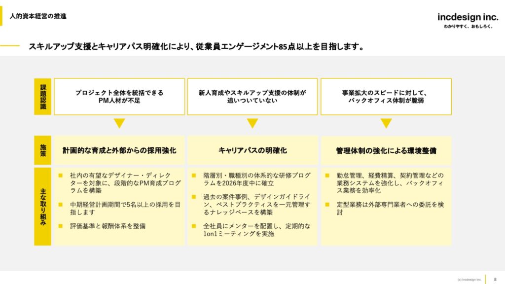 - 具体的なKPI(従業員満足度、離職率など)が設定されている