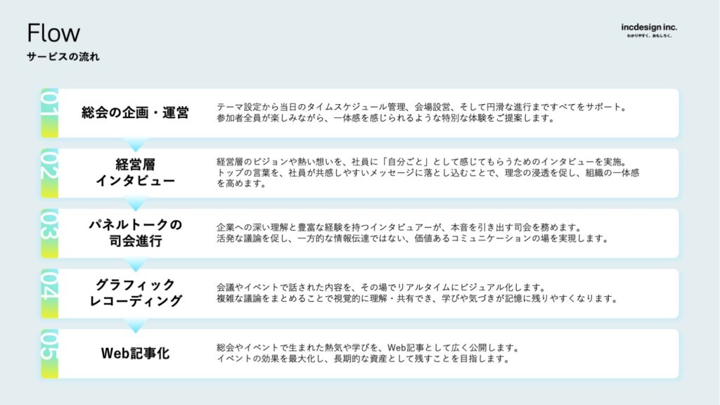 事前のお打ち合わせで目的やご要望を丁寧にヒアリングさせていただいた後は、企画、当日の運営、そしてアウトプットの作成まで、全て私たちにお任せいただけます。