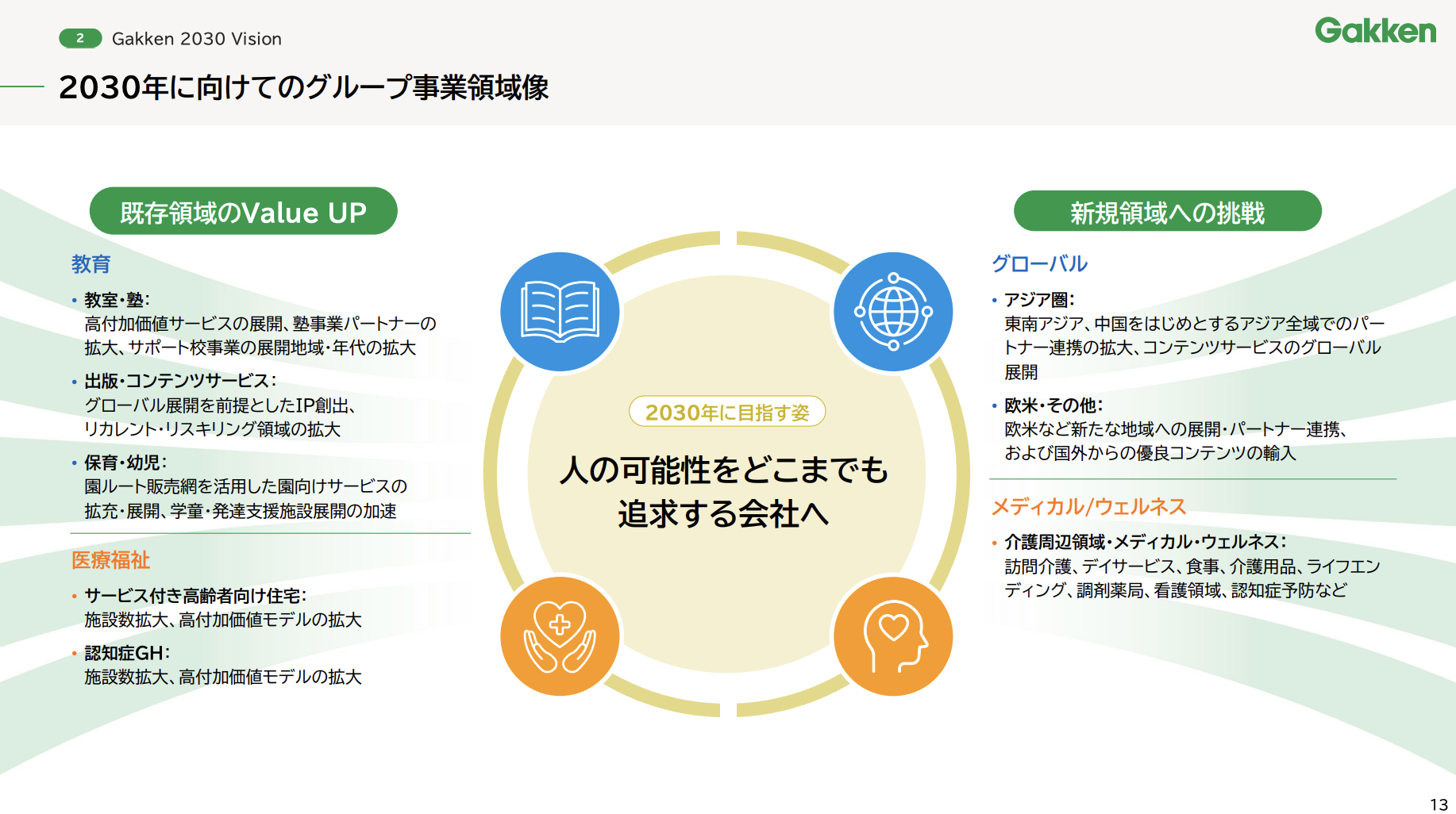 子ども向け教育サービスからお年寄り向けの医療福祉サービスまで、幅広い世代へサービスを展開している「親しみやすさ」をビジュアルで表現しました。 - 2030年の目指す姿の具体化