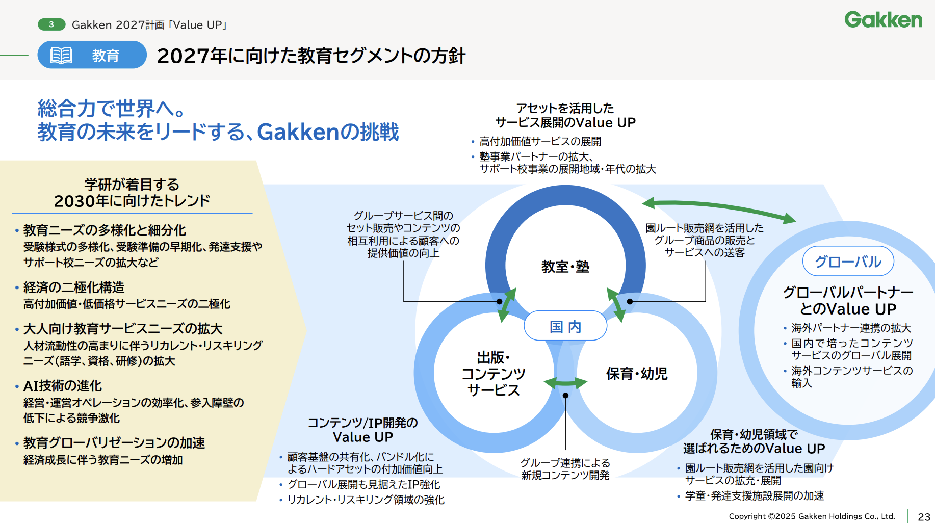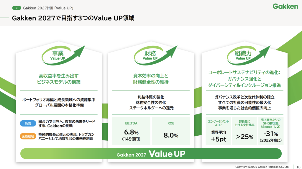 学研グループ中期経営計画「Gakken2027~Value UP~」3つのポイント