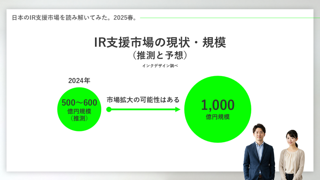 また、今後の成長を見据えた際、IR支援市場が1,000億円規模に達する可能性も十分に想定されます。