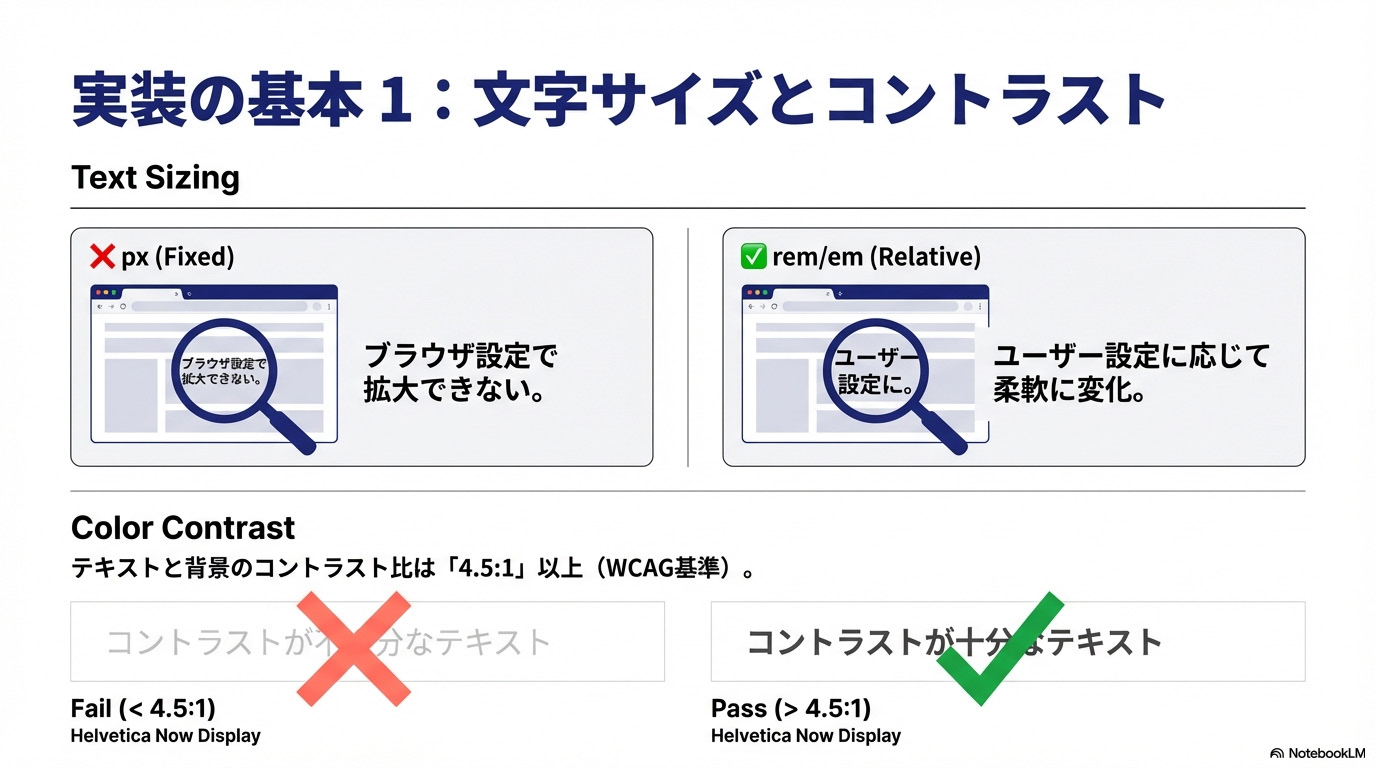ユーザーがブラウザのテキストサイズ設定を変更しても、レイアウトが崩れないようにします。固定サイズ(px)ではなく、相対サイズ(rem, em)を使用することで実現できます。 - 十分なコントラスト比の確保