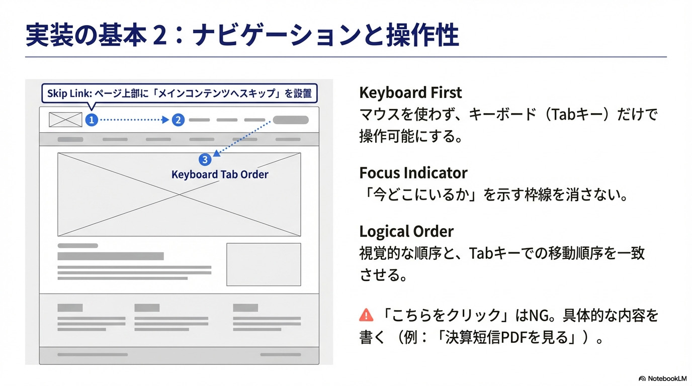 マウスを使わずに、すべての機能にアクセスできるようにします。- スキップリンクの設置:ページ上部に「メインコンテンツへスキップ」リンクを配置