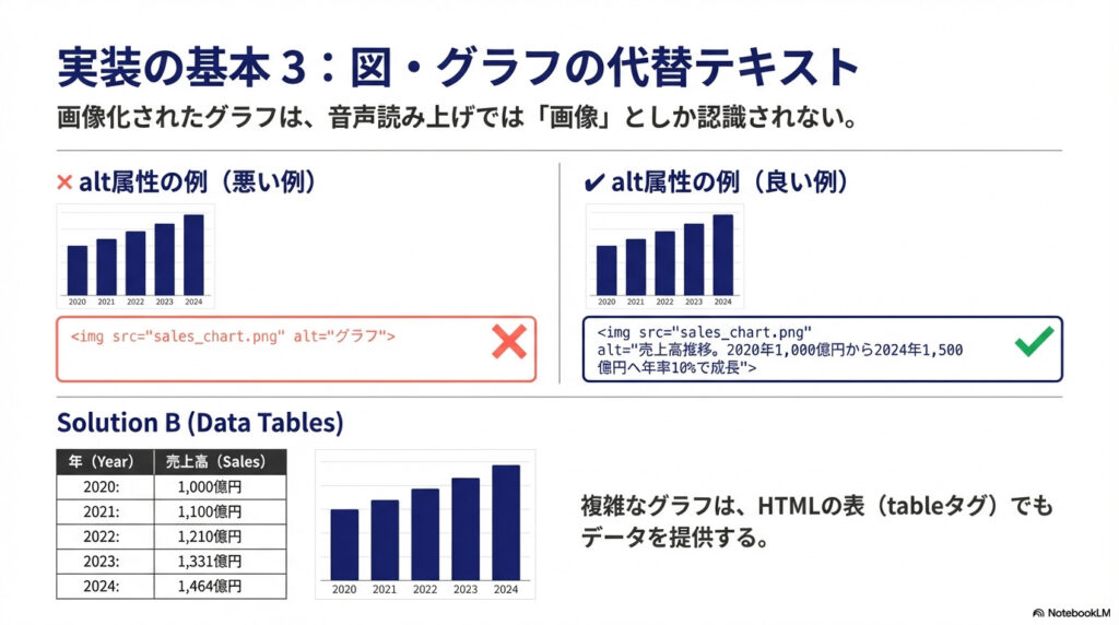 複雑なグラフの場合は、alt属性に加えて、グラフの直前または直後にテキストで説明を記載したり、データをHTML表形式でも提供したりします。