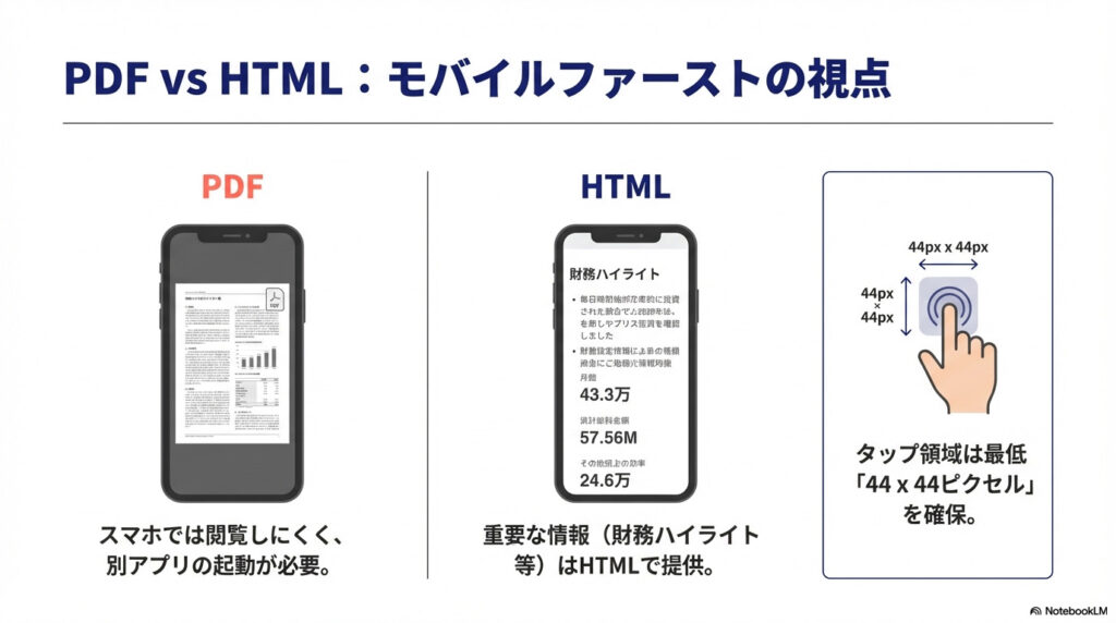 - PDFの代替としてHTMLで情報提供することは、スマホユーザー全般にとって快適