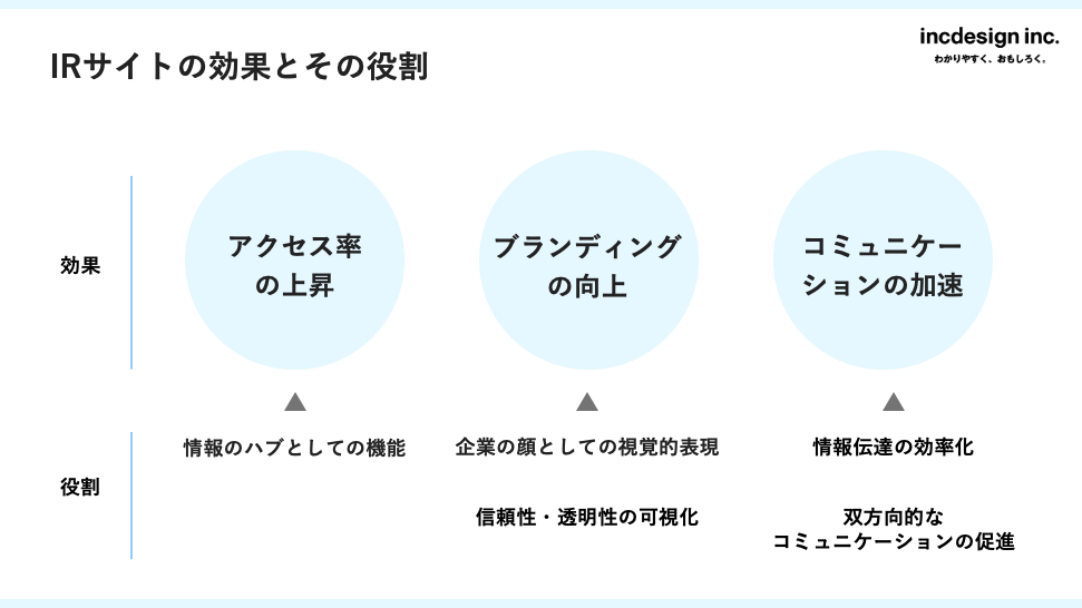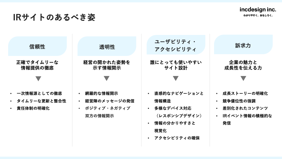 IRサイトは、特定の専門家だけでなく、様々な背景を持つ多様な投資家が利用するため、これら2つの要素は極めて重要です。