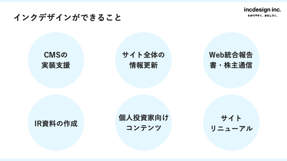 インクデザインでは、IRサイトにまつわる支援を幅広くしています!