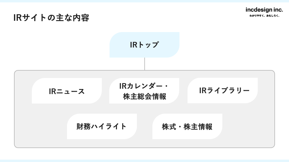 • 「IR情報」セクションがどこにあるか一目で分かり、必要な情報に迷わずたどり着ける構造であることが重要です。