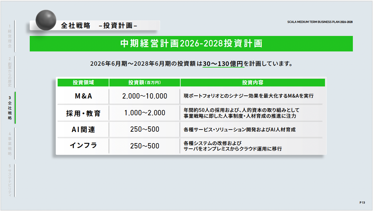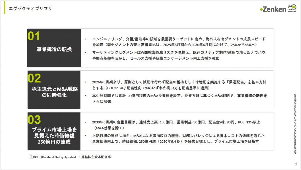 本中期経営計画では、企業価値の最大化と持続的成長の実現に向けた具体的な道筋として、事業構造の転換や株主還元とM&A戦略の同時強化、また、時価総額250億円の達成と東証プライム市場の上場を視野に入れた企業体質の進化などを設定しています。