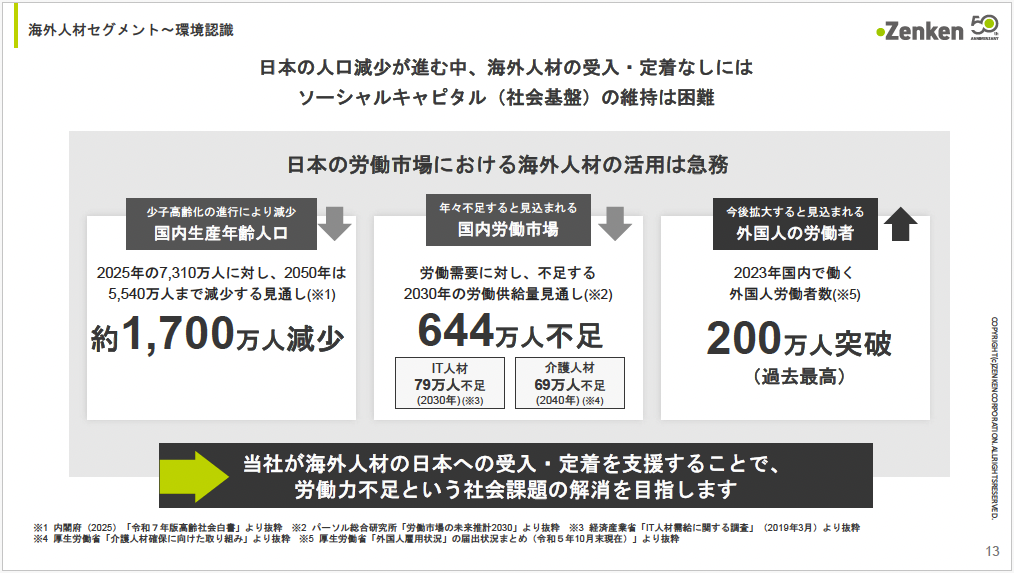 Zenken株式会社は、「そこにない未来を創る」をパーパスに設定し、WEBマーケティングと海外人材事業を軸に、日本社会が抱える人材不足や内需縮小といった社会課題の解決を目指しています。