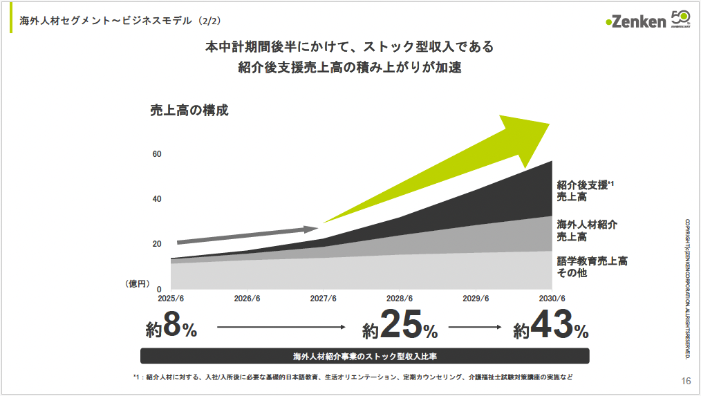 社会課題(人口減少と人手不足)を起点として、「取り組み」「ビジネスモデル」「重点KPI」へと続く一連の流れがスライド間で連携されています。特にストック型収入のさらなる増加に関しては、積み上げグラフにより成長を視覚的に強調することで納得感を高めていますね!