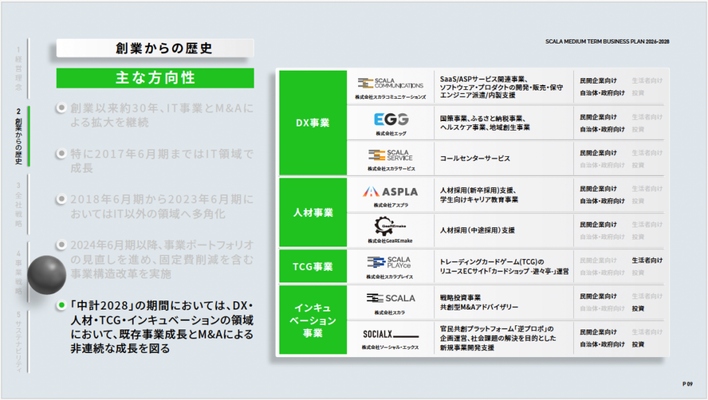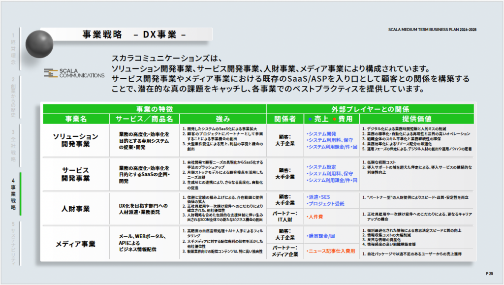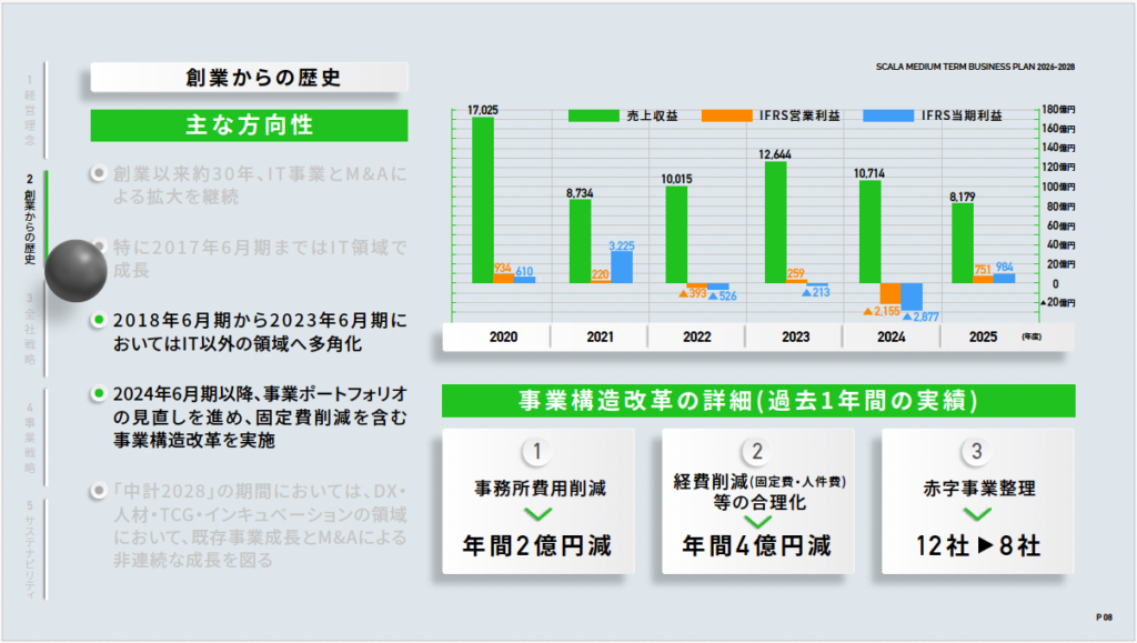 創業からの歴史を厚めに解説されています。2018年度以降はIT以外の領域への多角化、2024年度以降は事業構造改革の実行など、成長に至ったターニングポイントが明確。初見の方にも理解しやすい親切な内容にまとめられています。