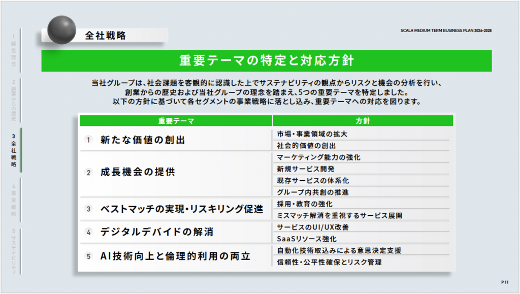 全社戦略は、「重要テーマの特定」から「定量目標」「投資計画」へと一貫した流れで構成されていて、サステナビリティ(社会課題)を起点とした成長戦略であることが明確です。