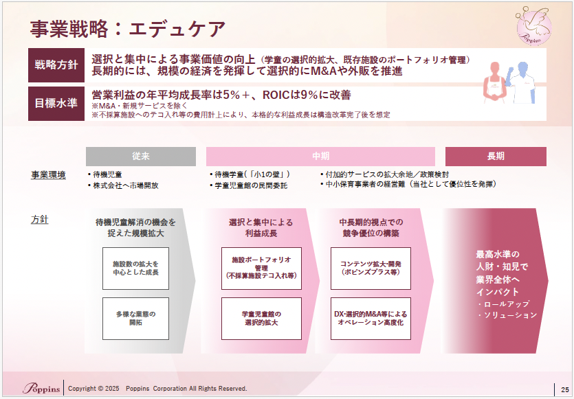 少子化や働き方の激変、ベビーシッター需要の想定以上の高まり、学童待機児童の増加などの環境変化と、評価・報酬制度や待遇などの抜本的な見直しといった状況を踏まえ、従来の中期経営計画を見直し。