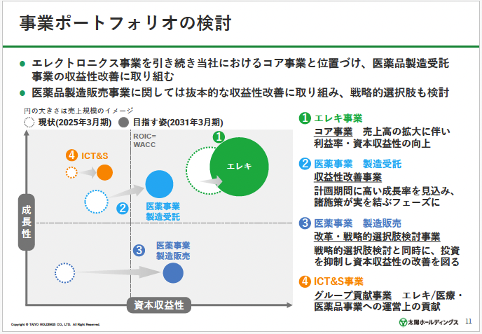 事業ポートフォリオの変化を散布図で示すことで、各事業の現状の位置付けと資本収益性を高める今後の方向性が明確ですね。これに市場環境の認識と戦略が紐づけられ、企業価値向上に向けた構造改革の意図が説得力を持って伝わります。