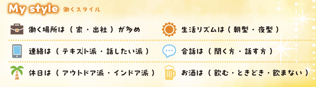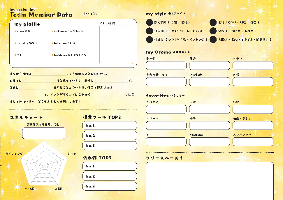 プロフィール帳を通して、新チームのメンバーそれぞれの意外な個性やスキルがわかり、非常に良いコミュニケーションのきっかけとなりました。ぜひ皆様もこちらのデザインをテンプレートとして、会社や学校などで作ってみてはいかがでしょうか。