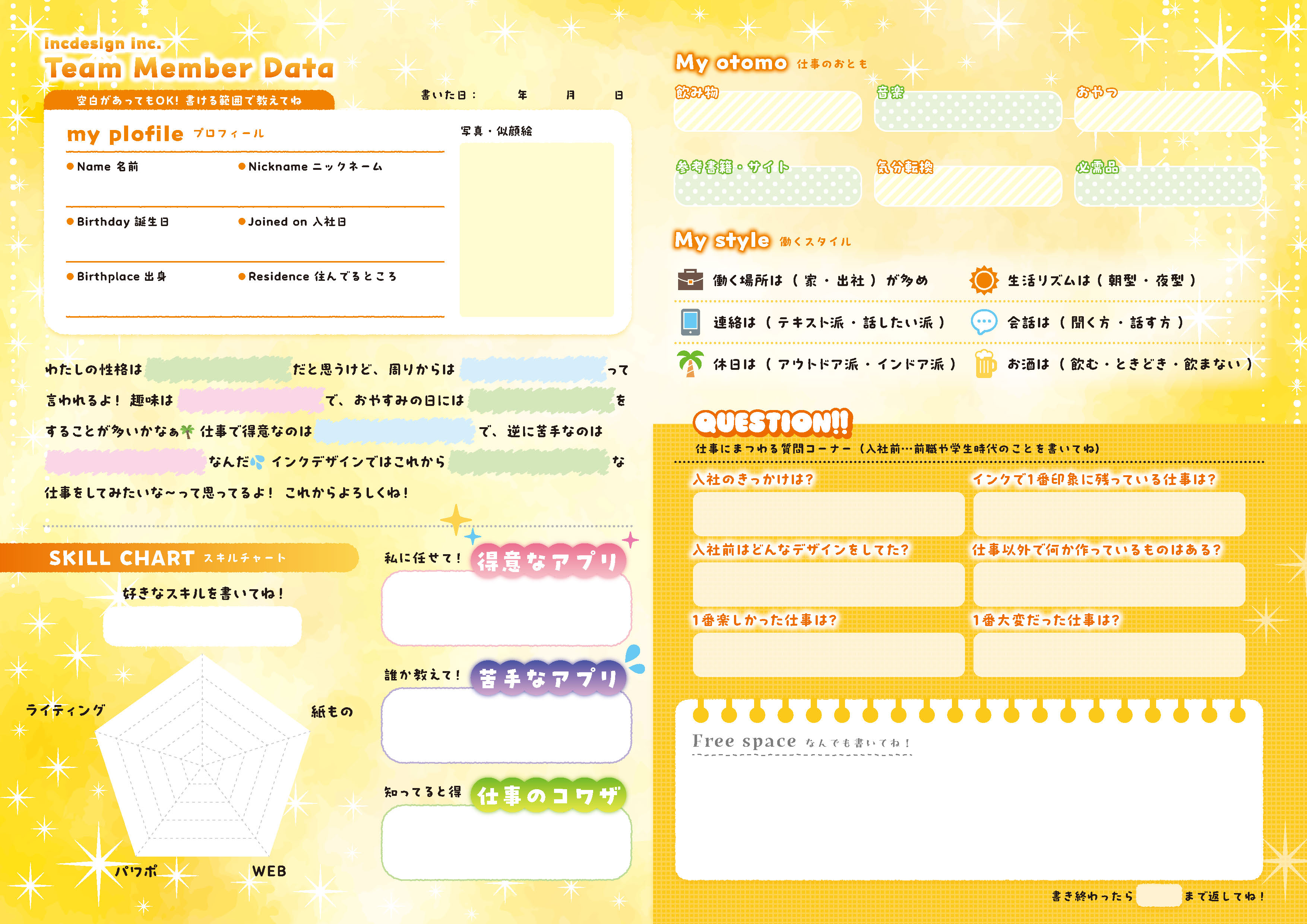 今回のプロフィール帳は、「みんなでワイワイできる懐かしさ」をコンセプトに作られたとの事。質問内容は仕事に即しつつ、個人のキャラクターが見えるようなものになることを目指したそうです。