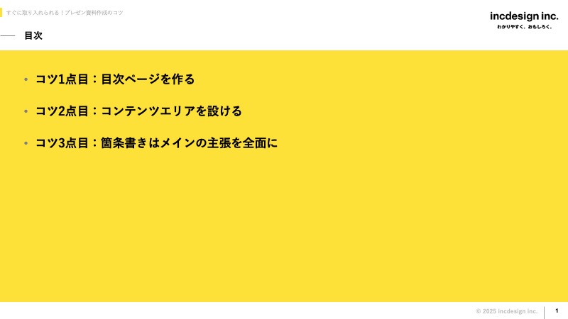 目次を作ることによって、資料としての構成がブレづらくなるのもメリットだと思います。