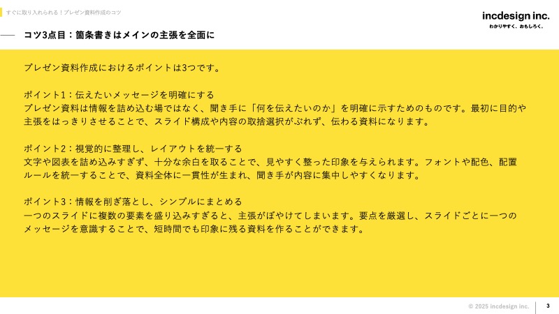 内容は同じなのに、「主張が3つあるんだな」ということが一目でわかりますよね。
