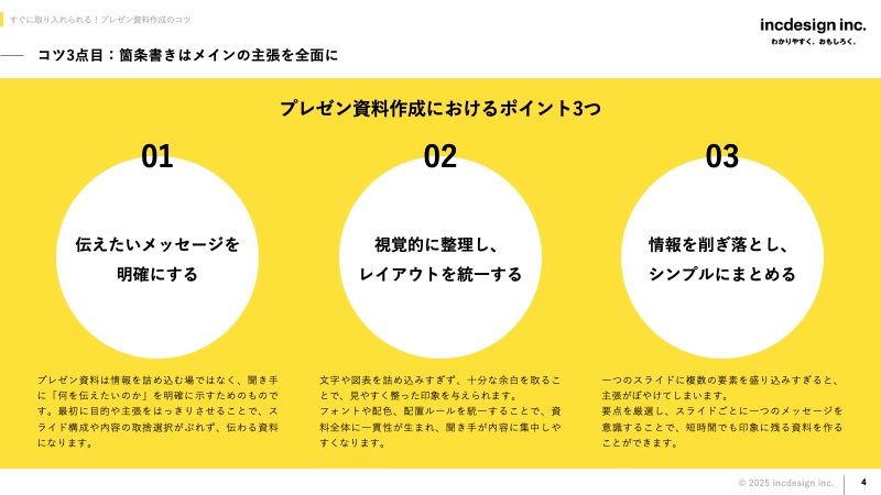 そんな私でも「こうしたらもっとよくなる!」と思った、すぐに取り入れられるプレゼン資料作成のコツを4点お伝えします。