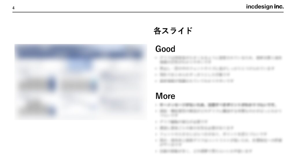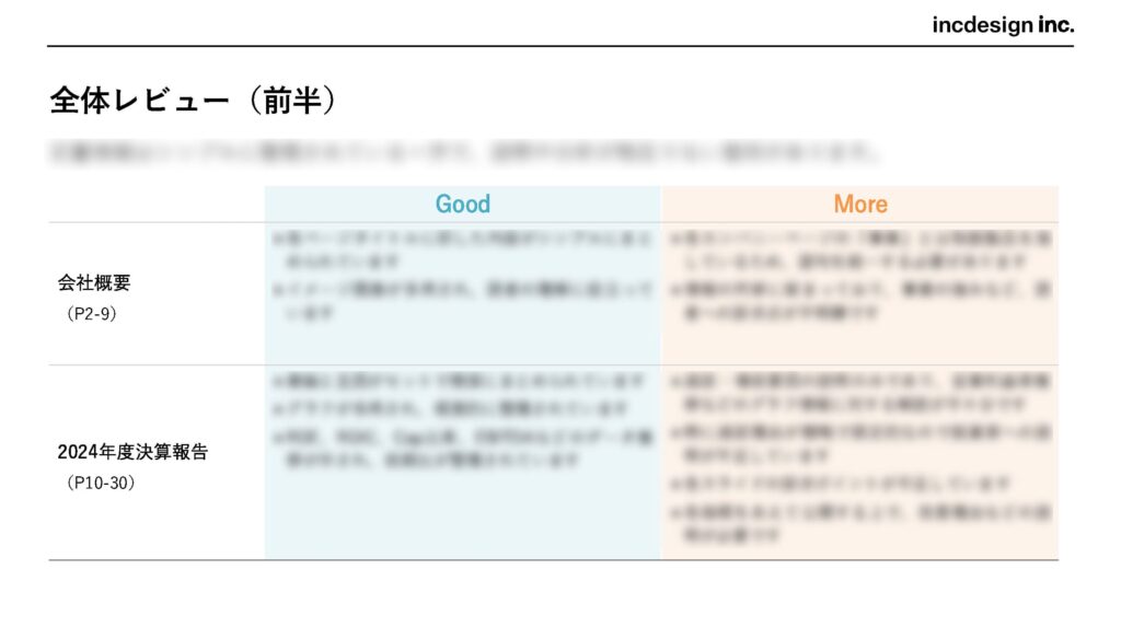 通常、全体レビュー(2~4ページ分程度)と、各スライドへの個別コメント(2~4ページ分程度)、改善ポイントまとめ(1ページ)を資料としてお渡ししています。
