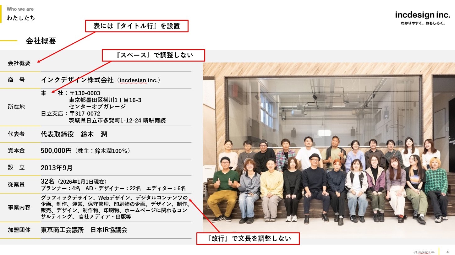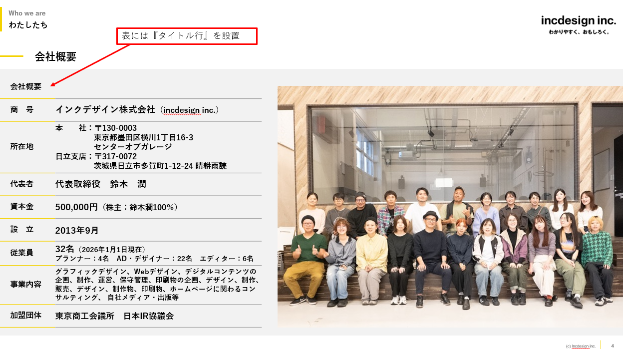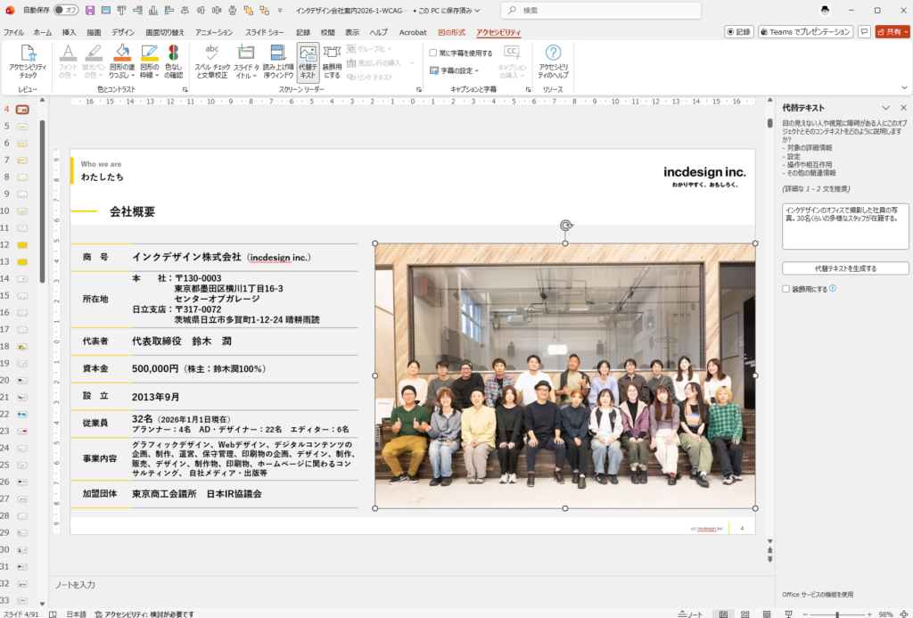 スライドのタイトルになる『会社概要』のようなテキストは代替テキストに書かないで、写真の意味を書きましょう。