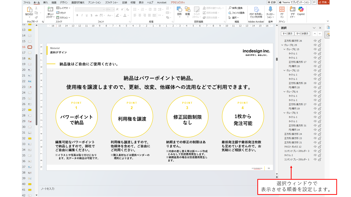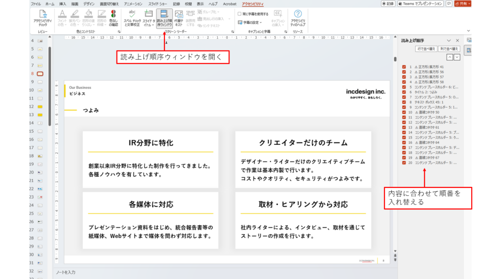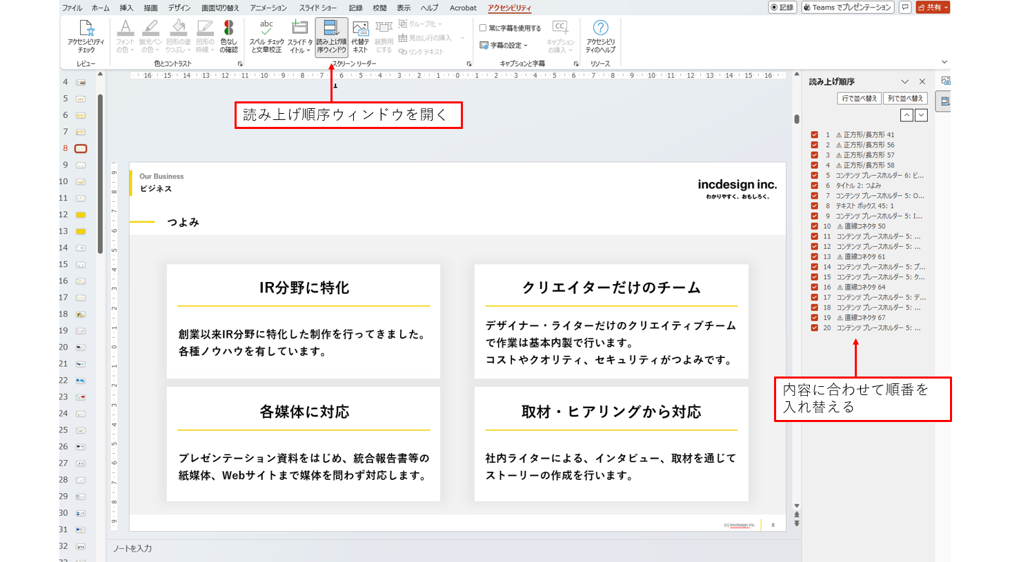 パワーポイントでは、画面上の見た目どおりに配置していても、読み上げ順(音声・キーボード操作の順序)が意図しない順番になっていることがあります。