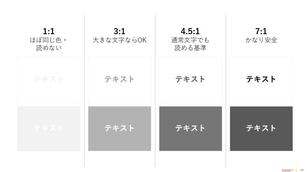 WCAG 2.1では、通常の文字について文字色と背景色のコントラスト比を 4.5:1 以上とすることが求められています。