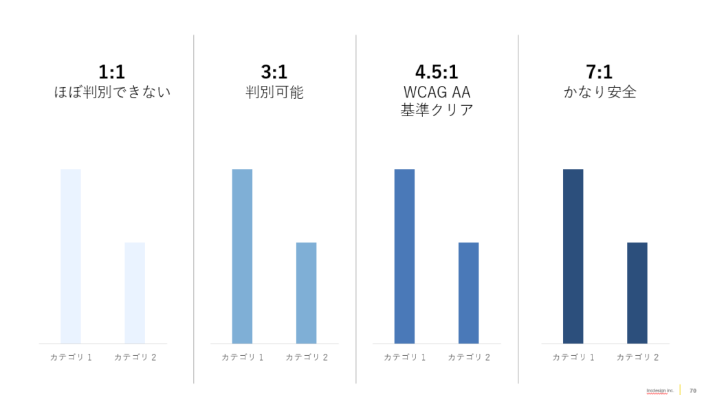 | 1.4.11 非テキストのコントラスト | グラフの枠線や図形の色も、背景との差(3:1以上)を付ける | AA | |