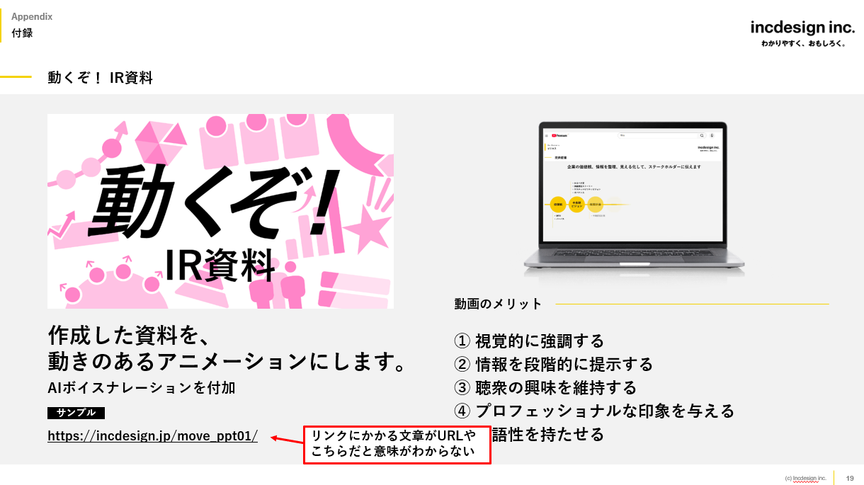 そのため、リンク文言には、リンク先の内容や資料名を具体的に記載します。