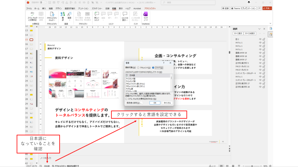パワーポイント側で「この文書は日本語です」と正しく認識させておくことで、PDF書き出し時にその情報が引き継がれます。
