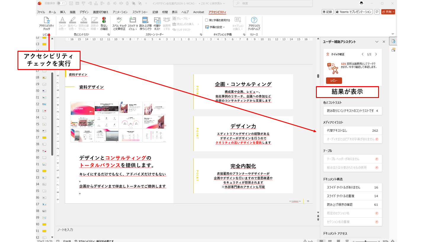 アクセシビリティ→アクセシビリティの確認で文章内のチェックができます。該当の箇所を示してくれるので一つ一つ直していきます。