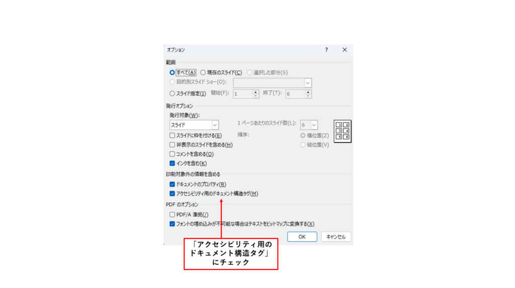- 「アクセシビリティ用のドキュメント構造タグ」にチェックが入っていることを必ず確認してください。